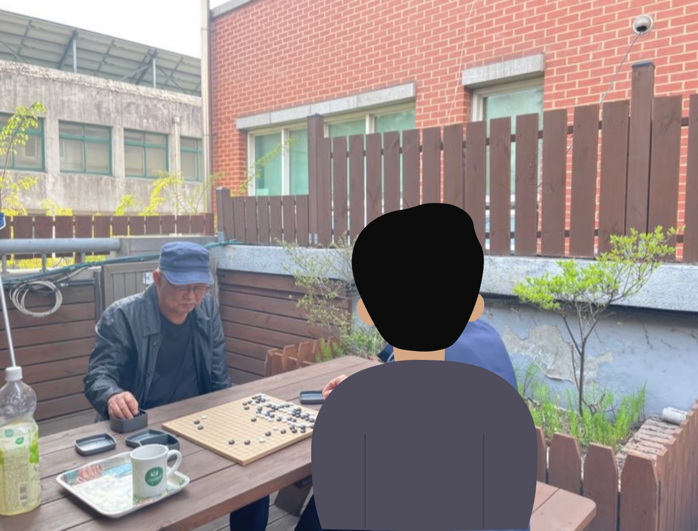 감사하게도 조 씨 어르신께서 복지관 앞 벤치에 도착해 계셨습니다. 최 씨 아저씨가 복지관에 도착하실 때까지 조 씨 어르신과 바둑, 축구, 야구 이야기를 나눴습니다. 최 씨 아저씨가 도착하고 두 분께서 악수하며 인사 나누셨습니다. 모임 장소로 이동하던 와중 본관과 별관을 잇는 야외 데크를 지나가고 있었습니다. 두 분께서 날도 좋으니 여기서 바둑 두면 어떠냐고 먼저 말씀하셨습니다. 미리 준비해둔 바둑판, 바둑알을 잽싸게 야외 데크로 옮겼습니다.