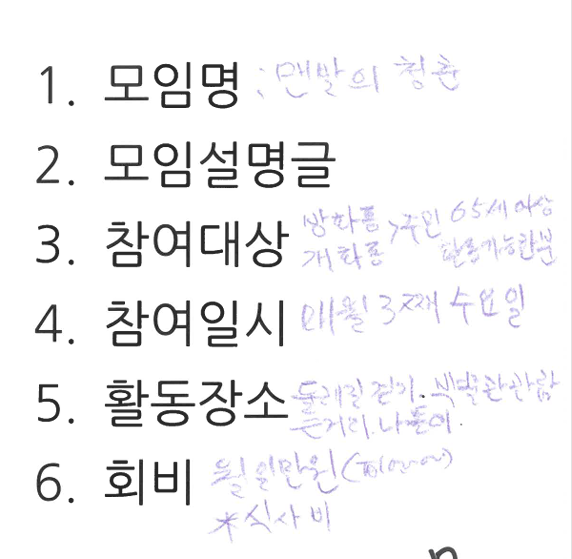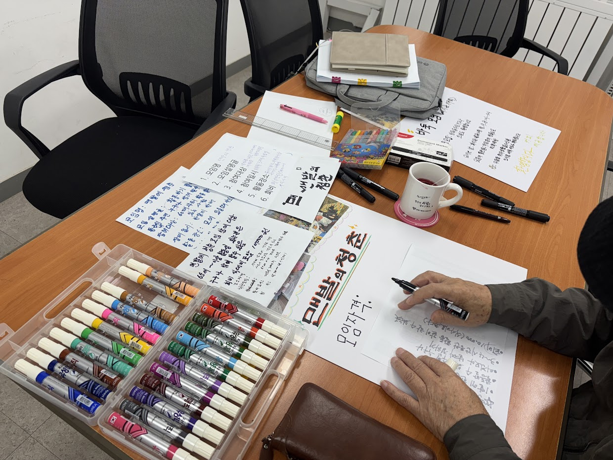 그렇게 맨발의청춘 회원분들이 함께 복지관에 모여 축제 부스를 어떻게 운영할지, 축제에 오는 주민들에게 모임을 어떻게 소개할지 이야기 나누셨습니다.