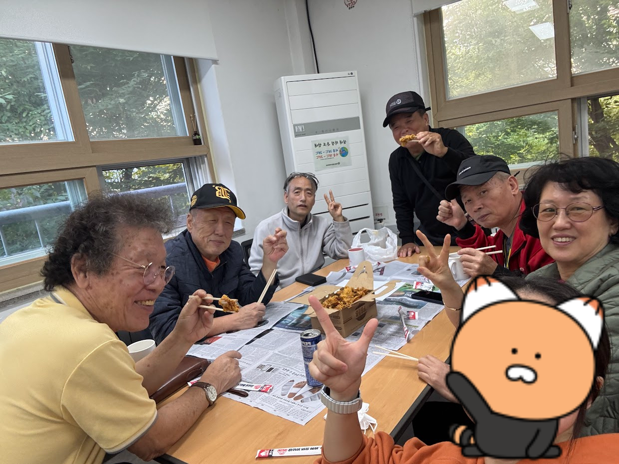 10월 맨발의청춘은 오랜만에 복지관 관내에서 모였습니다. 사실 처음에는 강원도 철원 고석정에 다녀오는 것으로 계획했지만, 담당자인 저를 비롯한 주민들의 건강 상황이 좋지 않은 상황이 발생했습니다. 이런 고민을 회원님들과 함께 소통하는 단체 채팅방에 나누자, 회장님께서 "다들 몸도 안 좋기도 하고, 다음 달에 있을 두근두근우리마을 축제도 준비해야 하니 복지관에서 만나면 어때요? 제가 치킨 쏠게요."라고 제안하셨습니다.