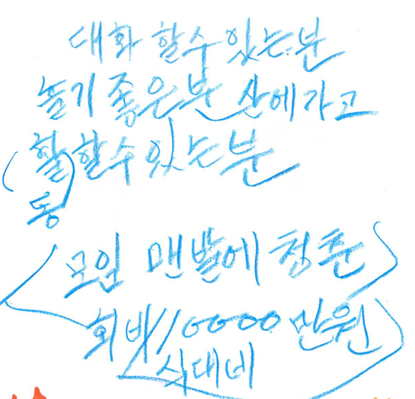 치킨을 다 먹은 다음, 축제에 우리 모임을 어떻게 소개할지 이야기 나눴습니다. 각자가 생각하는 대로 모임을 소개하는 자료를 만들고, 좋은 내용들을 모아 최종 꾸밈판에 작성하기로 했습니다. 꾸밈판은 글씨를 잘 쓰는 회장님께서 써주셨습니다. 덕분에 저도 우리 회원님들이 맨발의청춘을 어떻게 생각하고 계시는지 잘 알 수 있었습니다. 감사합니다!