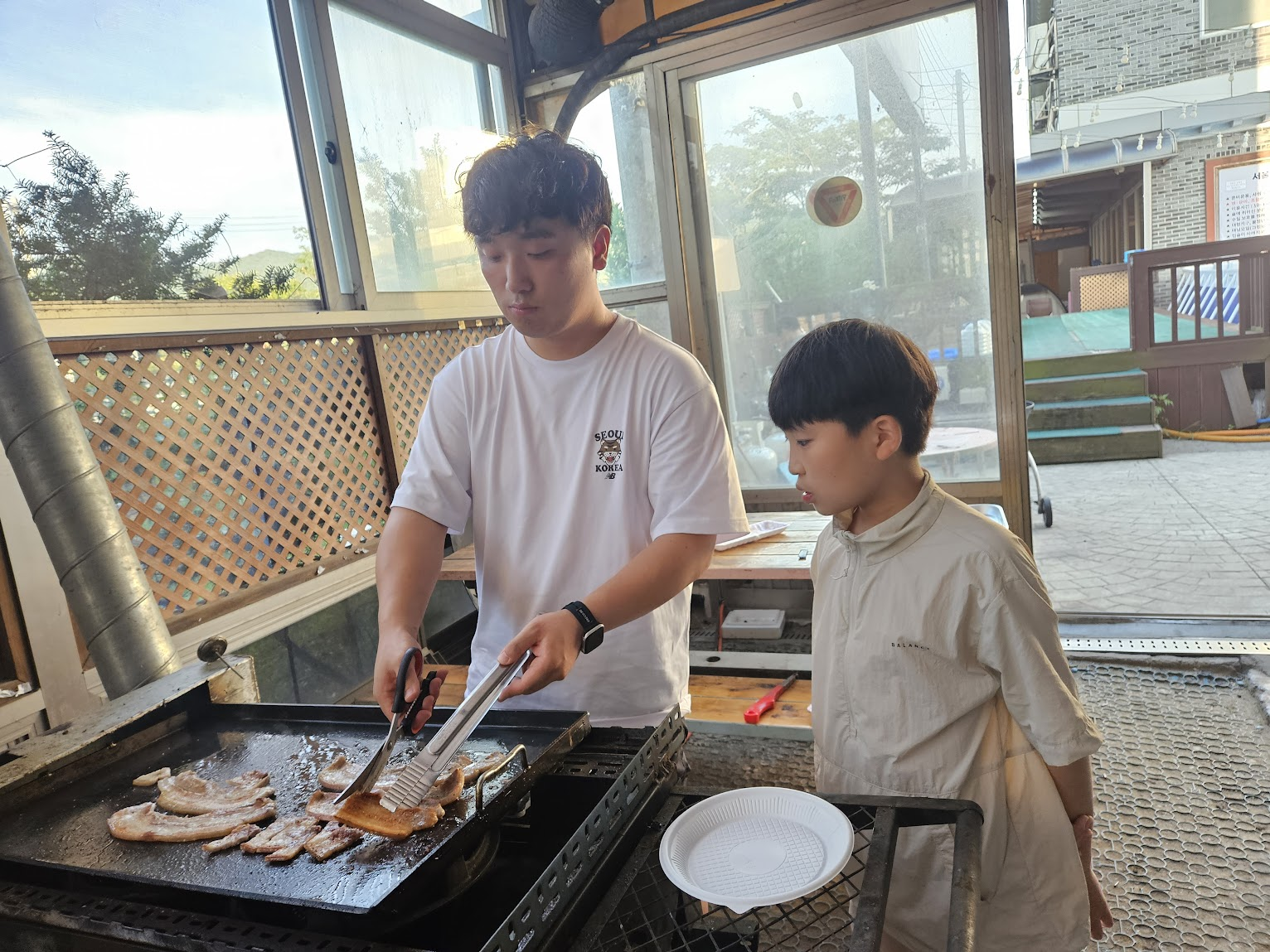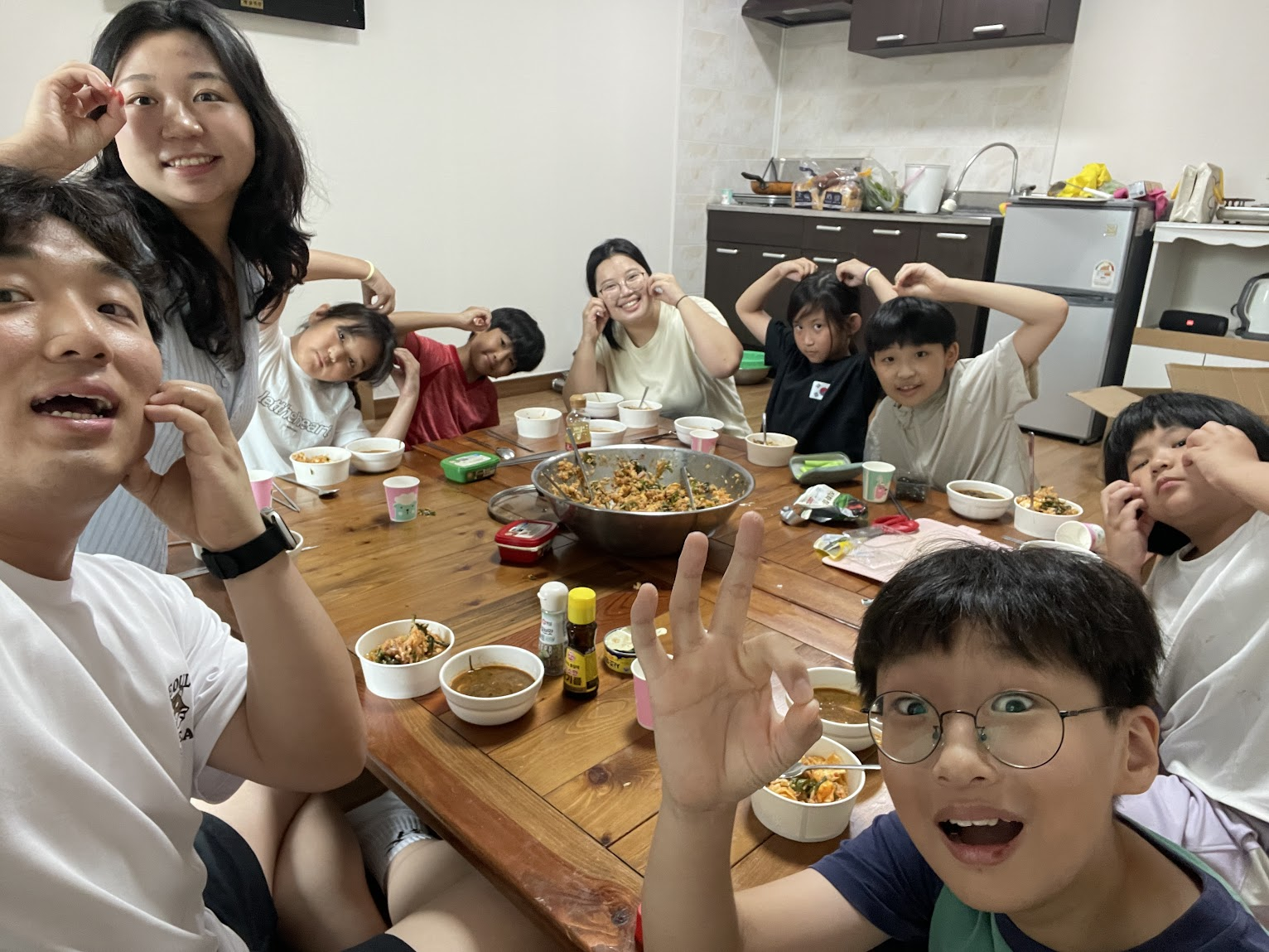 저녁에는 바비큐 식사를 준비하며 상추를 씻고 냉면을 만드는 등 역할을 나누어 서로 도왔습니다.