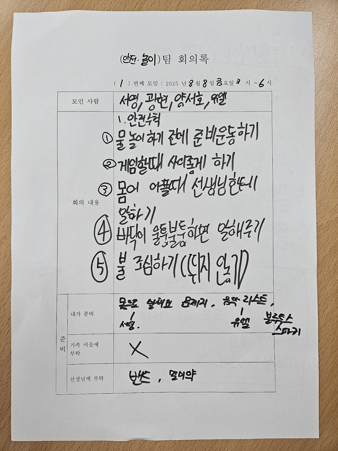 안전수칙, 식사 계획, 놀이 활동 등을 각 팀이 서로 의논하여 결정하였으며